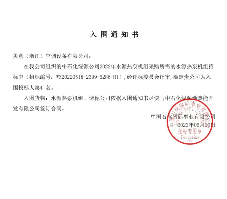 Mammoth was once again shortlisted as the procurement unit of water source heat pump of Sinopec Green Source Company